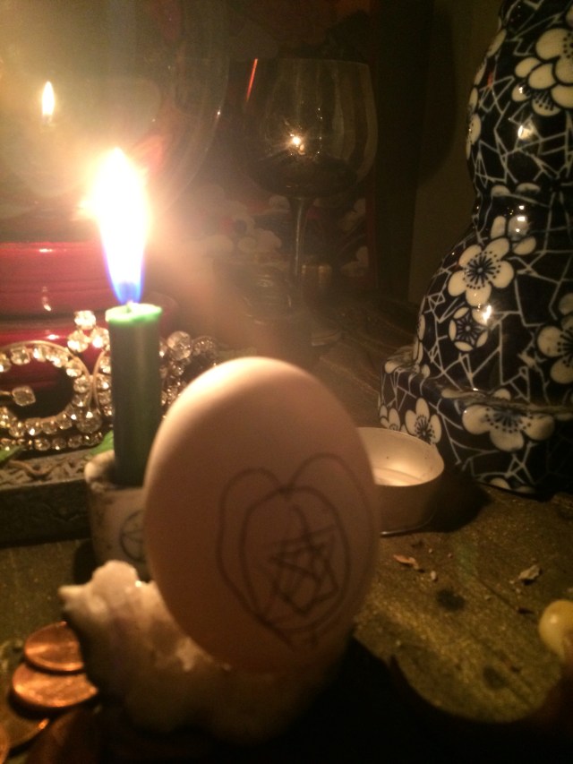 When you are finished drawing, offer the egg to the god and goddess. Hold it up in front of the candle and say, “The intentions in this egg, I offer to you, god and goddess. If it is for the greater good, bring me what I desire so mote it be.”