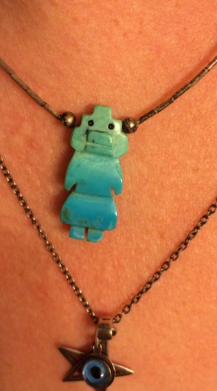 So today I decided to try out ta little, turquoise, hand carved kachina necklace. I found it when Linda and I were combing through a lot of jewlery looking for silver, gold and diamonds.