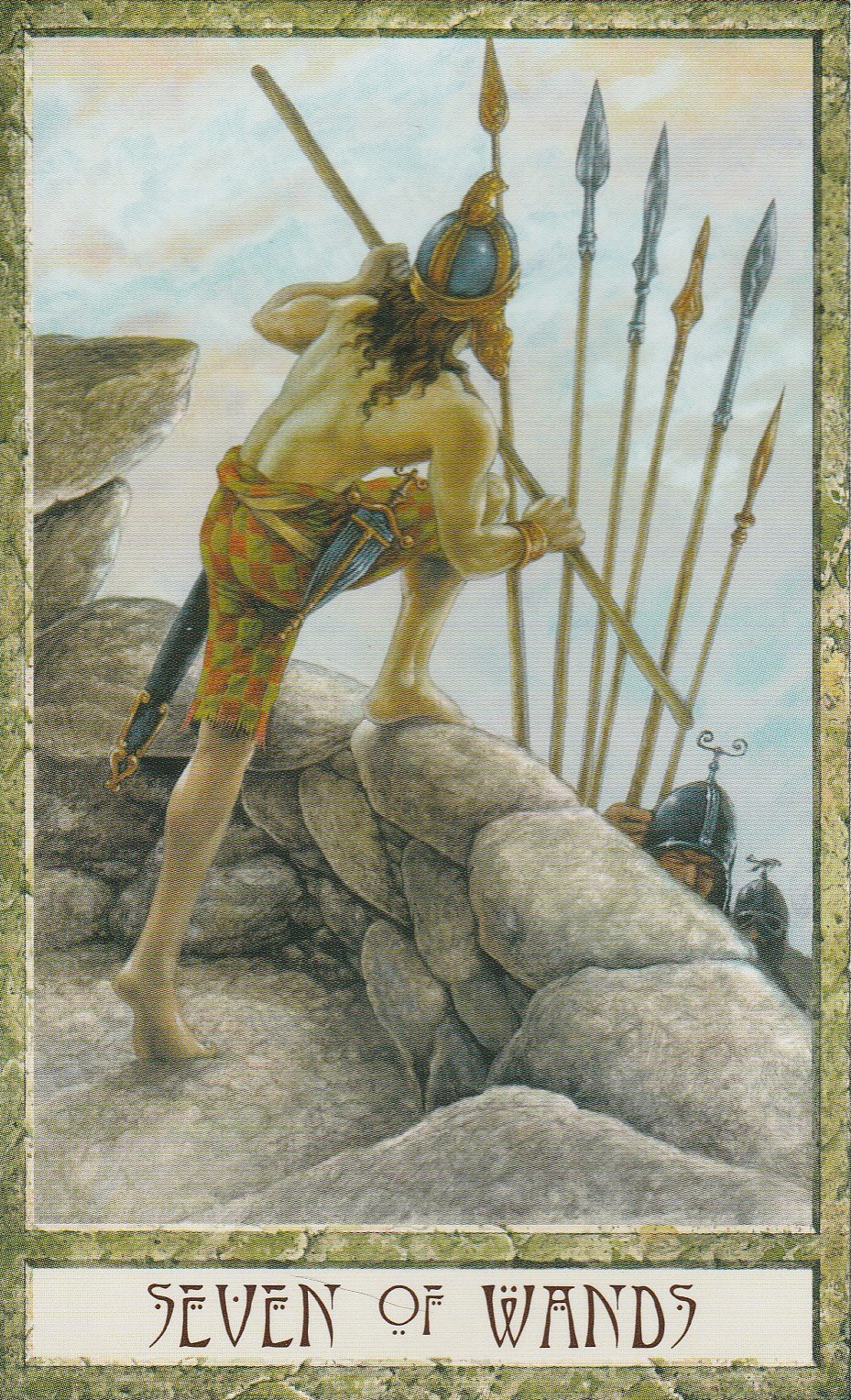 (Seven of Wands card from the Druidcraft Tarot. I do not claim the rights to this image)