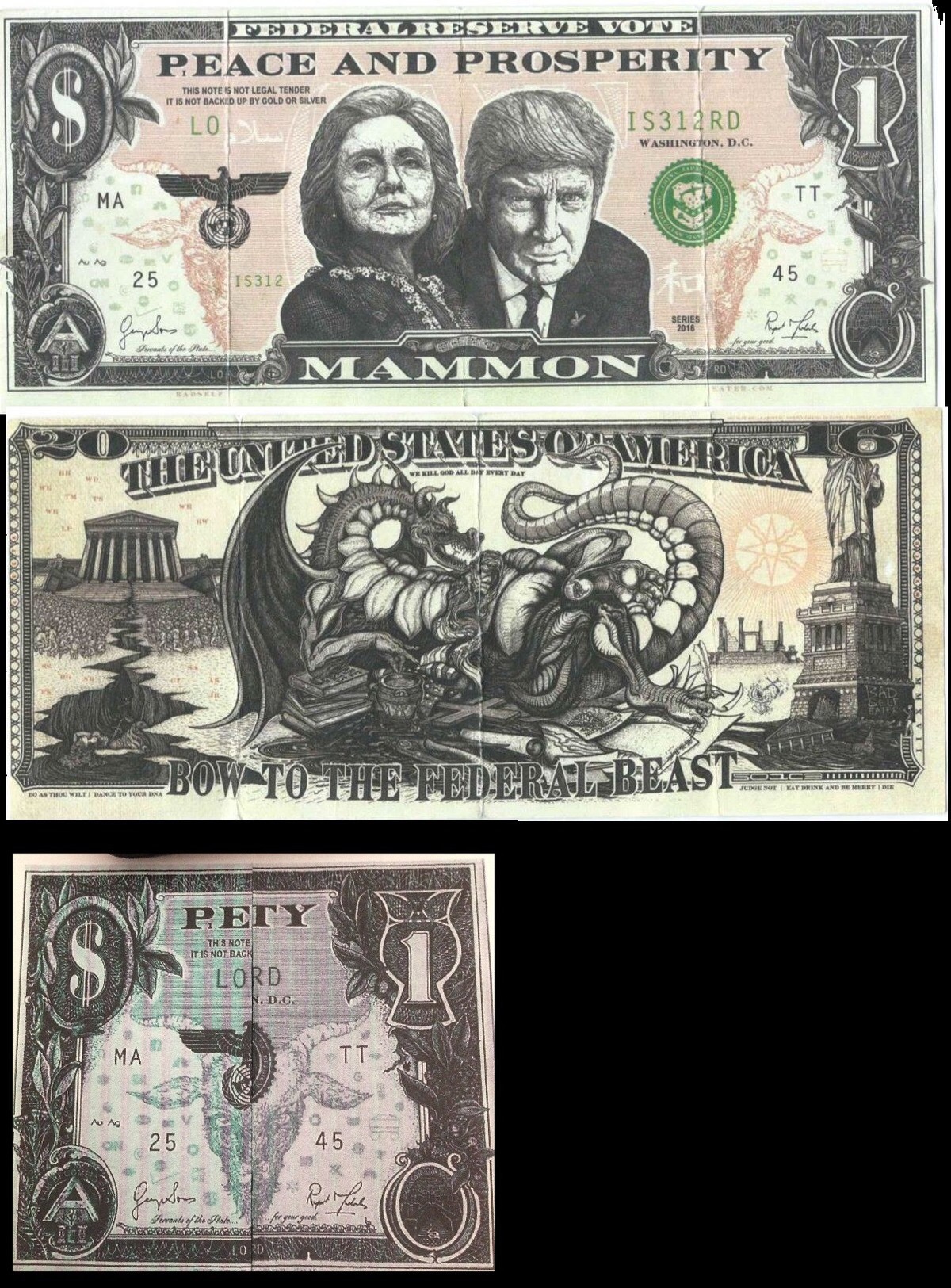 Mammon is a name of “the Devil”, probably one of the many ancient gods that became demonized when the church was trying to stamp out paganism. Funny because this bill “demonizes” politicians. I believe the “A” to stand for either Armageddon on Anarchy or Adonai. I’m going with Anarchy though because this person seems like he or she definitely wants to see a violent revolution. There’s an orobous, the sign of the recycling of universal energy. This most likely related to this political cycle and federal banks that need to “forcefully” be destroyed before “we’re destroyed”. There’s a compass which I think is a reference to the Angels of the four directions who will be main players in the Apocalypse (Raphael: east, Michael: South, Gabriel: West, Uriel: North). It could also mean that whatever happens at the end of the countdown will span the four directions. This could also be a reference to the 4 Horsemen of the Apocalypse. Furthermore, Archangel Michael will “slay the beast”, who is depicted on the back of the bill. (Sidenote: from my research, I believe Michael is the warrior side of Jesus Christ so it also refers to the 2nd coming).
