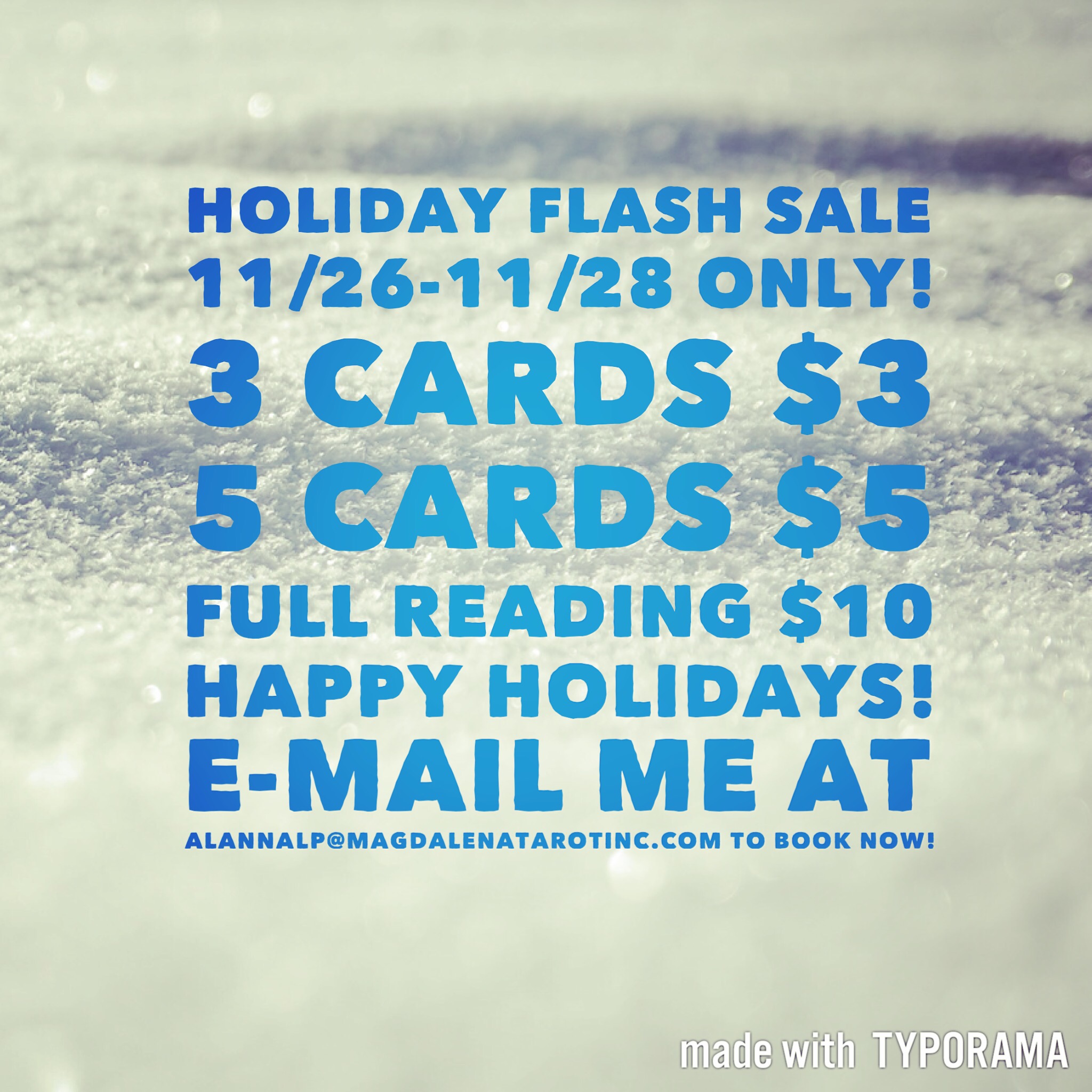 Flash Sale! Get a super secret deal on a Tarot Reading from now through Cyber Monday! Do you need to patch something up with someone before the holidays but don’t know how? Are you looking for guidance improving your abundance in the next year? If you’ve wanted to get a reading from me but have been hesitant because of the price, now’s your chance to cash in on my gift to you.