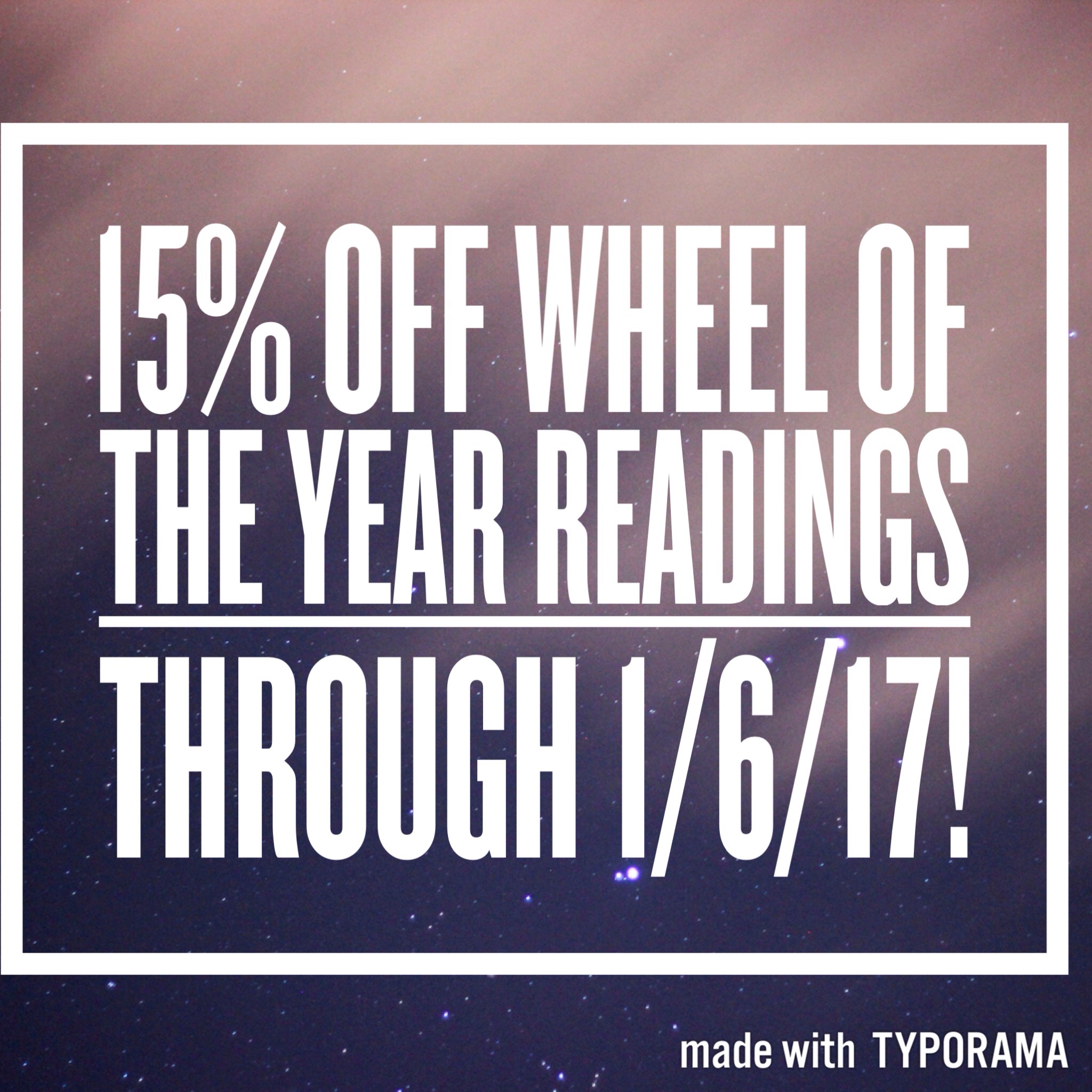 What does #2017 have in store for you? Get your Wheel of the Year Reading to find out! This spread features a card a month for 12 months to give you an idea of what’s ahead. But book now! That’s a 12 card spread valued at $40 for just $34! But hurry! This sale only lasts until 1/6/17! Go to book a reading to book today!