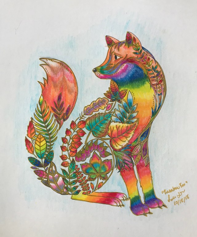 Then I set to decoding the meaning of the name “Rainbow Fox”. I found a picture of an ethereal fox in a coloring book I have at my desk and meditated on idea of what a Rainbow Fox is. In 2012 I did a Shamanic journey with Barbara Ann Ilari because I was exploring different paths and trying to find the right spiritual journey for me. Barbara told me to wait for a name to come to me and while I was hula hooping with my LED hoop, I saw a Rainbow Fox in the lights. I colored the picture as I connected with the memory.