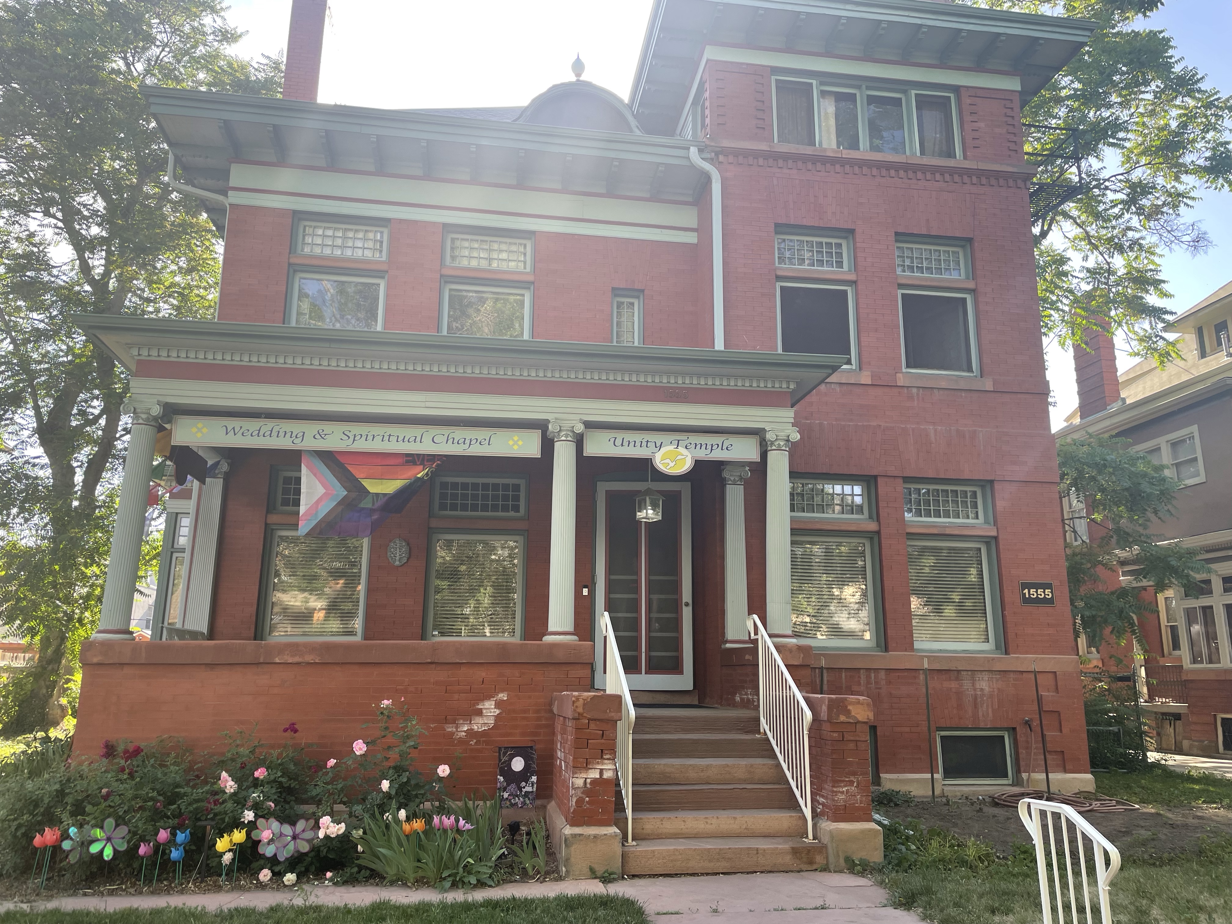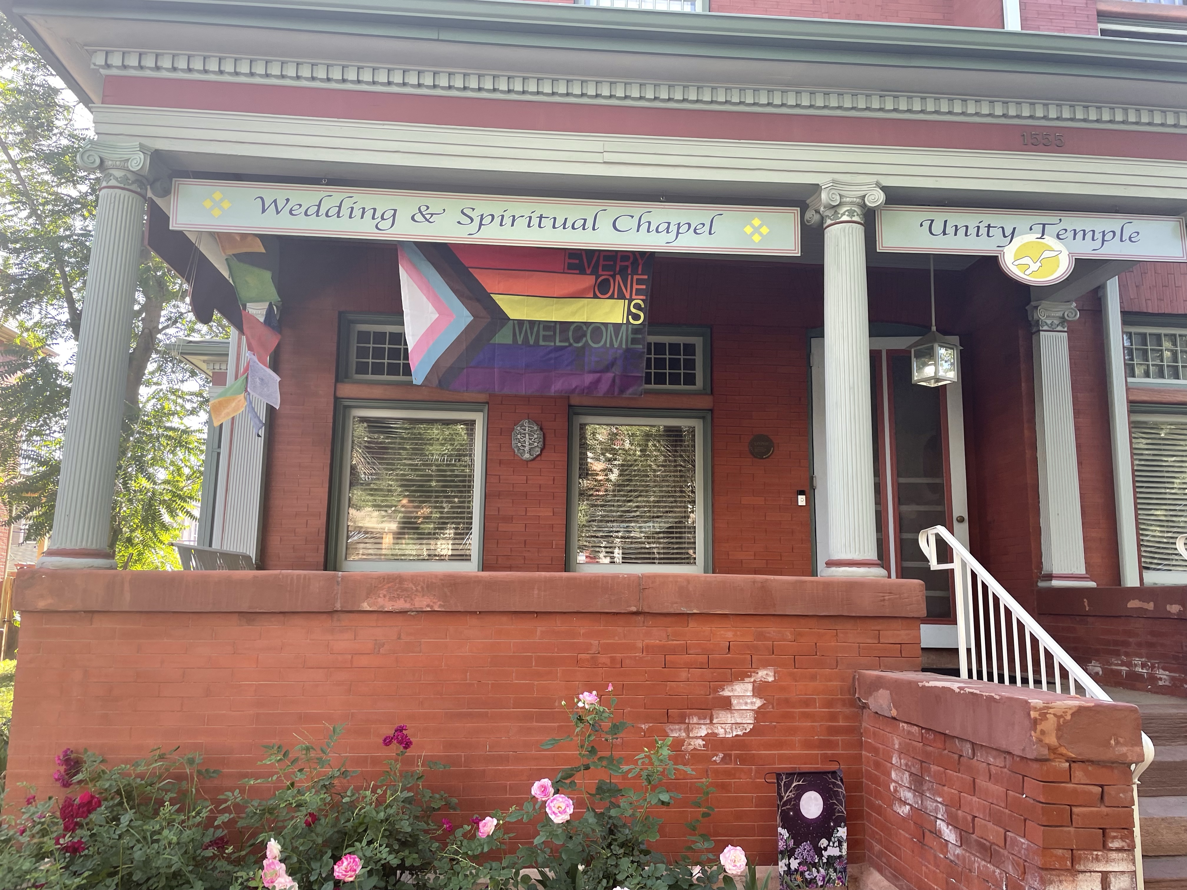 We’re ready for Pride at Unity Temple! Our flag blew away a couple of times but I finally got it to stay. It says “Everyone is welcome here.”