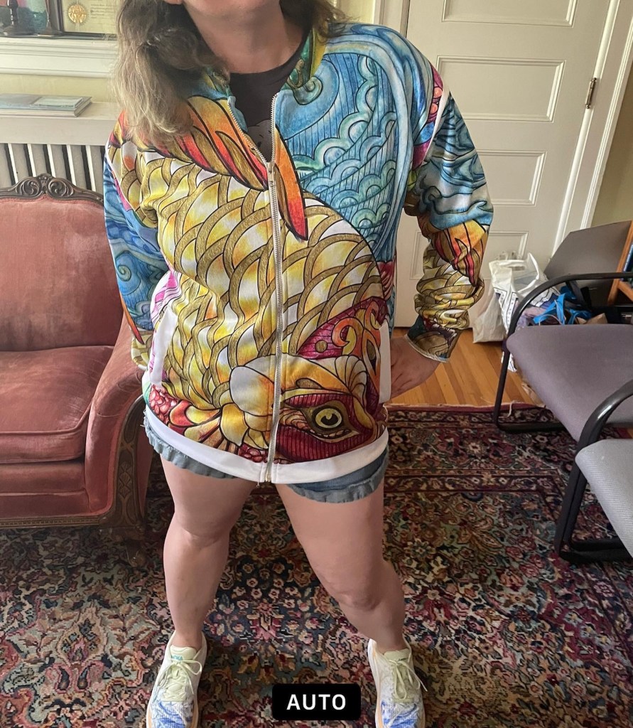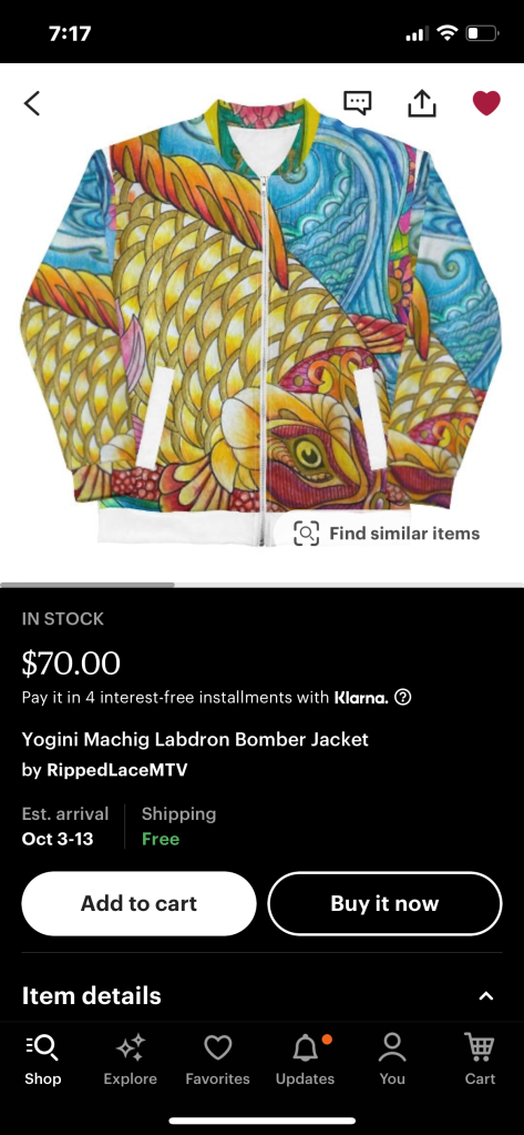 It was my first time wearing the jacket outside the house. The design is below. The jacket had a Bodhisattva on the back I thought about how in Buddhism, the aim is to be free from desire and attachment to material things. I thought about how those truly dedicated to a Buddhist path trade in their clothes for simple robes. I connected with the bodhisattva in that moment and knew giving the man my jacket was the right thing to do with colder weather on the way.